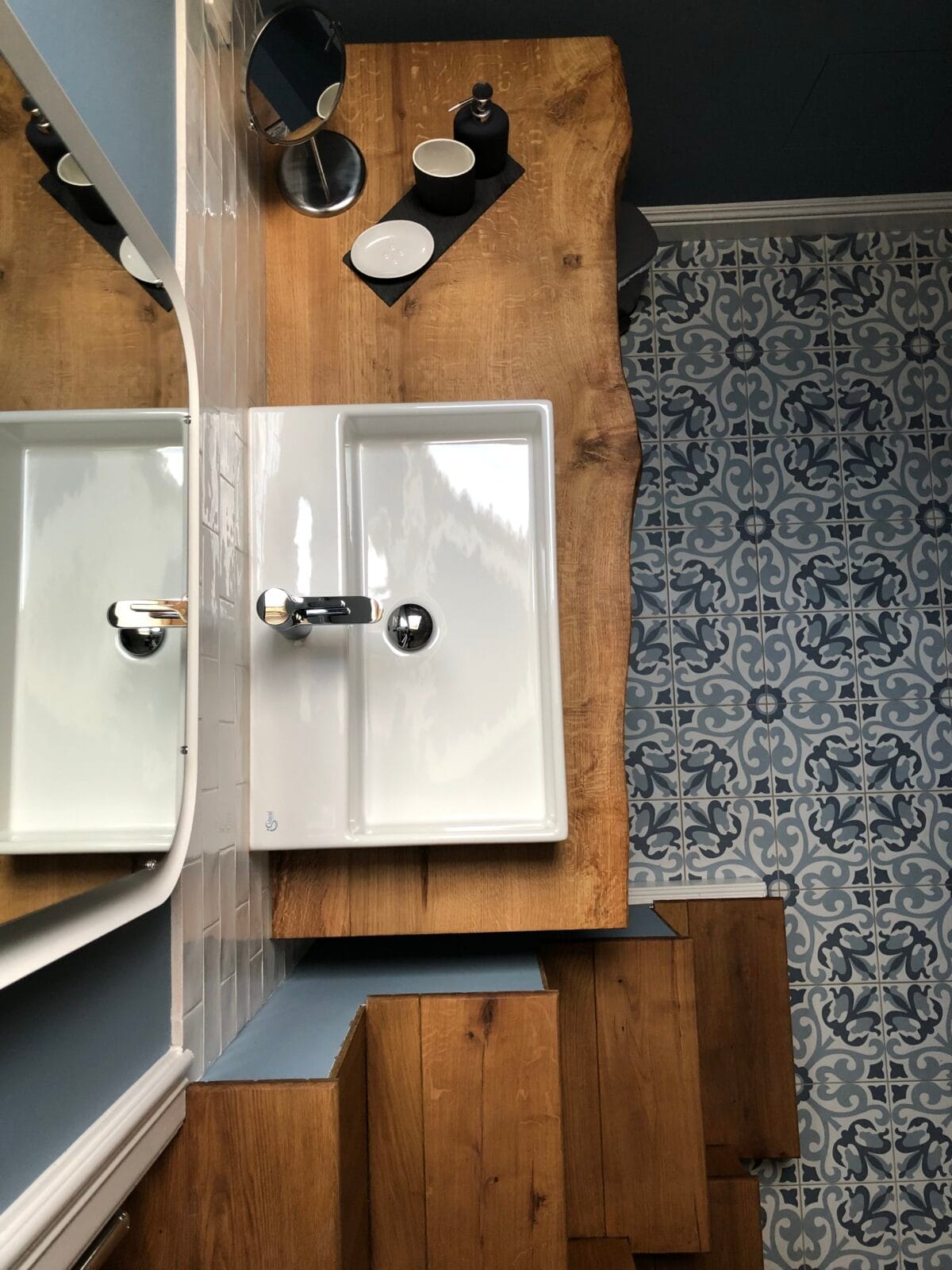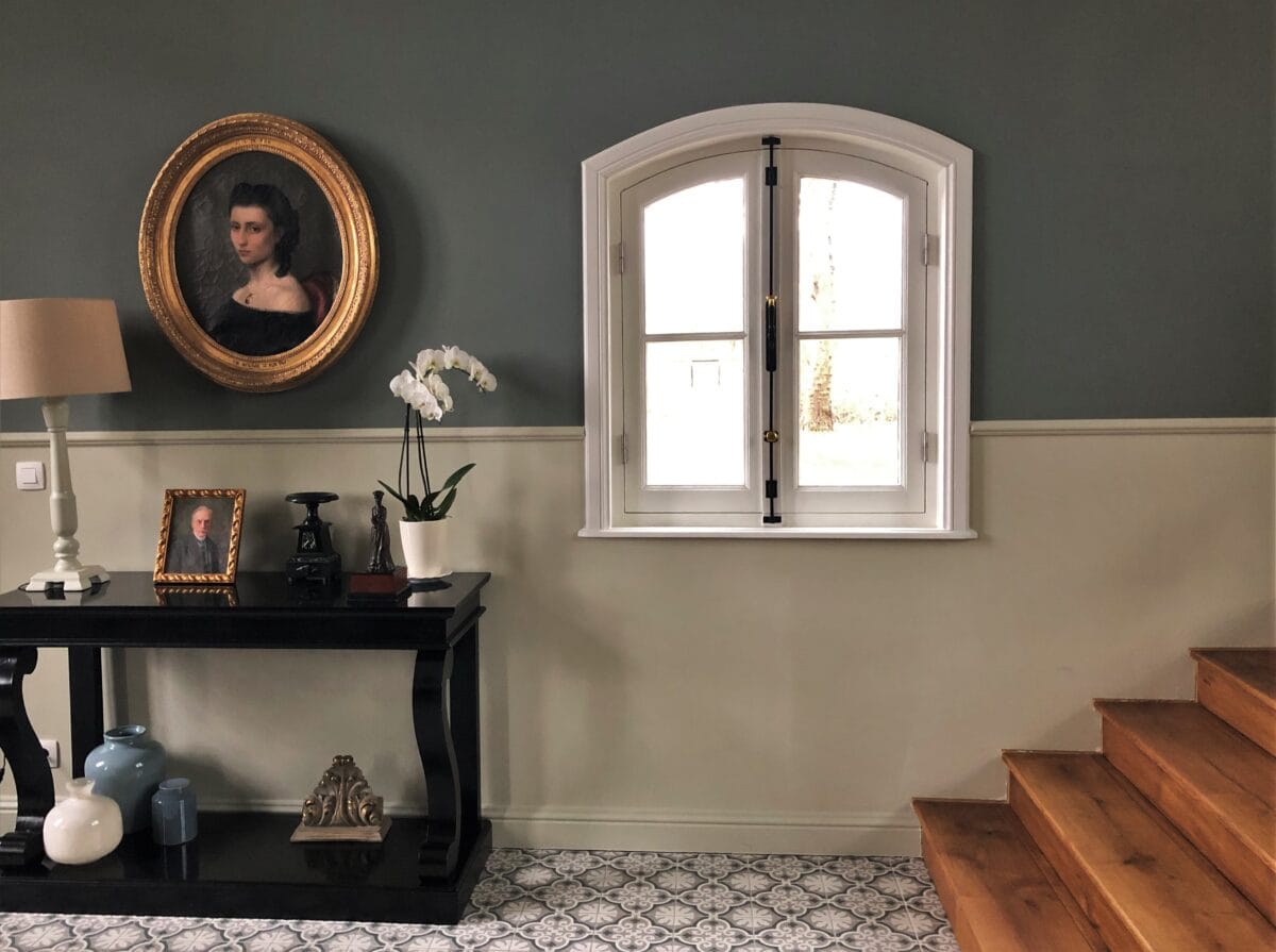 De gastheer gaf me een rondleiding bij binnenkomst. Het lukte me nauwelijks om te luisteren, zoveel indrukken tegelijk. Niet alleen voelde ik de bijzondere historie van deze plek, tegelijkertijd was de renovatie verbluffend goed gelukt. De kleurnuances van artisjokgroen en antiek blauw tot loodgrijs en royaal beige, alles perfect in balans. En de inrichting van de leefruimte, salon en slaapkamers hadden diezelfde finesse. Het ensemble sloot naadloos aan bij het sfeervolle karakter van Antonine’s schilderkunst, die overal in het atelier te bewonderen was.